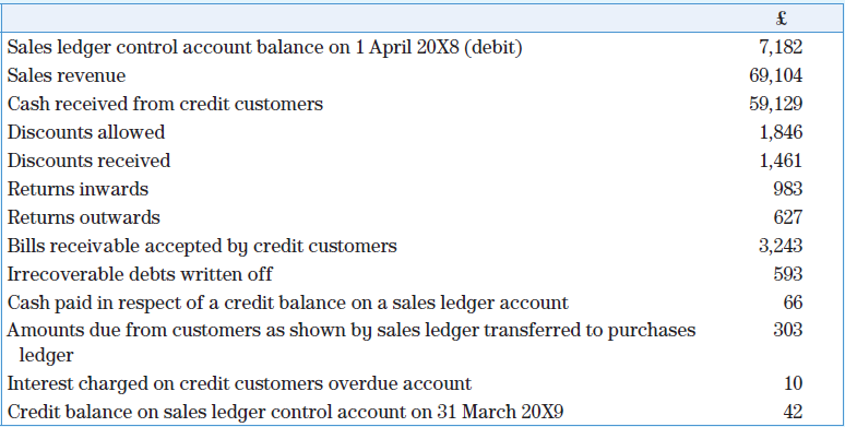 Prepare the sales ledger control account for the year ended 31 March 20X9, using relevant figures selected from the data shown above.