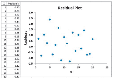X Residuals 1 0.70 Residual Plot 2 -0.78 3.0 3 1.03 4 0.33 2.5 2.39 2.0 -0.67 7 0.16 1.5 1.65 1.0 -1.19 10 0.84 A 0.5 11 0.29 12 -1.28 0.0 13 1.21 -0.5 14 -0.37 15 1.02 -1.0 16 -0.16 -1.5 17 1.42 5 10 15 20 25 18 -0.71 19 -0.03 20 0.67 Residuals on