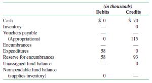 (in thousands) Debits Credits Cash so S 70 Inventory Vouchers payable (Appropriations) 115 Encumbrances Expenditures 58 Reserve for encumbrances 58 93 Unassigned fund balance Nonspendable fund balance (supplies inventory)