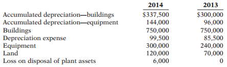 2014 2013 Accumulated depreciation-buildings Accumulated depreciation-equipment Buildings depreciation expense Equipment Land $337,500 144,000 750,000 99,500 300,000 120,000 6,000 $300,000 96,000 750,000 85,500 240,000 70,000 Loss on disposal of plant assets