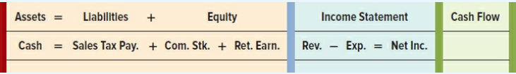 Assets = Llablitles + Equlty Income Statement Cash Flow Cash = Sales Tax Pay. + Com. Stk. + Ret. Earn. Rev. Exp. = Net Inc.