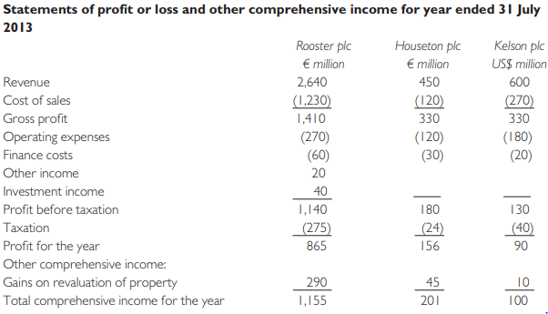 Statements of profit or loss and other comprehensive income for year ended 31 July 2013 Rooster plc € million Houseton plc € million Kelson plc US$ million Revenue 2,640 450 600 Cost of sales (1,230) (120) (270) Gross profit Operating expenses 1,410 330 330 (270) (60) (120) (30) (180) (20) Finance costs Other income 20 Investment income 40 Profit before taxation 1,140 180 130 (275) 865 Taxation (24) (40) Profit for the year Other comprehensive income: Gains on revaluation of property Total comprehensive income for the year 156 90 290 45 10 1,155 201 100
