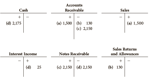 Accounts Cash Receivable Sales + (а) 1,500 | (b) 130 (c) 2,150 (d) 2,175 (a) 1,500 Sales Returns Interest Income Notes Receivable and Allowances + + (d) 25 (c) 2,150 (d) 2,150 (b) 130