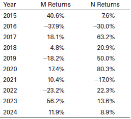 Year M Returns N Returns 2015 40.6% 7.6% 2016 -37.9% -30.0% 2017 18.1% 63.2% 2018 4.8% 20.9% 2019 -18.2% 50.0% 2020 17.4% 80.3% 2021 10.4% -17.0% 2022 -23.2% 22.3% 2023 56.2% 13.6% 2024 11.9% 8.9%