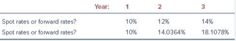 The following table contains spot rates and forward rates for three years. However, the labels got mixed up. Can you identify which row of the interest rates represents spot rates and which one the forward rates?