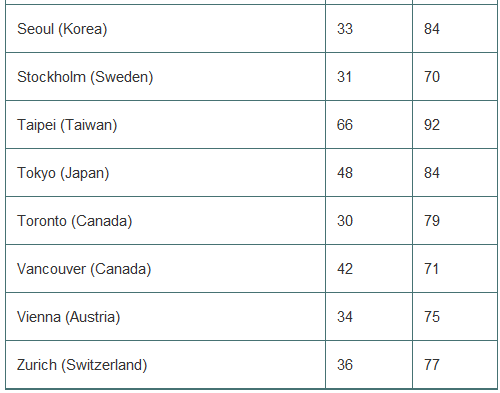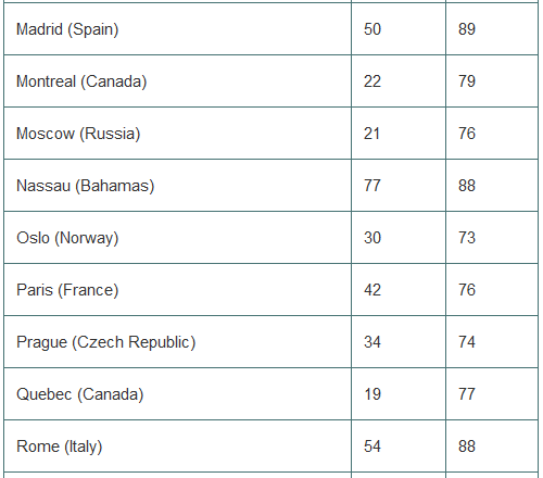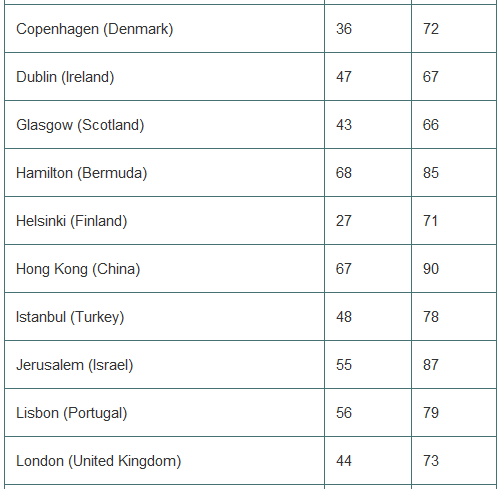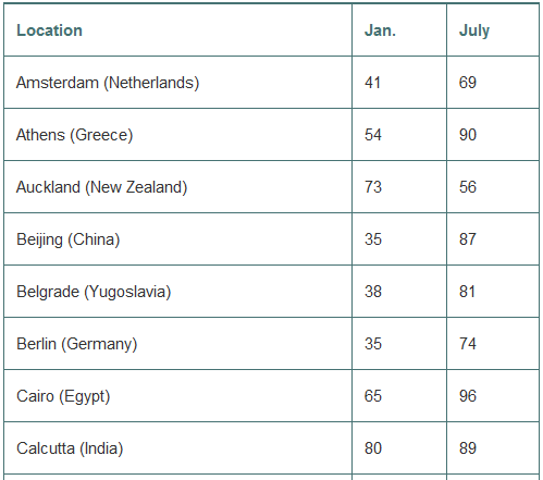 The following table gives the average daily high temperatures in January and July for several cities. Find a 95% confidence interval for the mean temperature difference between summer and winter.