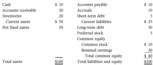 $ 10 20 Cash Accounts payable $ 10 Accounts receivable Accruals 10 Inventories 20 Short-term debt 5 Current assets $ 50 Current liabilities $ 25 Net fixed assets 50 Long-term debt 30 Preferred stock Common equity Common stock $ 10 Retained earnings Total common equity Total liabilities and equity 30 $ 40 $100 Total assets $100