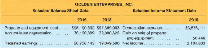 Golden Enterprises reported expenditures for property and equipment of $ 1,182,854 in 2016. In addition, the company acquired property and equipment valued at $239,382 in a noncash transaction in 20 I 6.