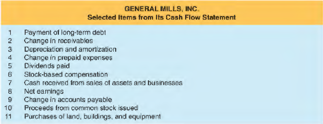 The following table presents selected items from a recent cash flow statement of General Mills, Inc . For each item, determine whether the amount would be disclosed in the cash flow statement under operating activities, investing activities, or financing activities. (General Mills uses the indirect General Mills, Inc. method of reporting cash flows from operating activities.)