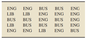 The following table provides data on college for the students in one section of the course Introduction to Computer Science during one semester at Arizona State University. In the table, we use the abbreviations BUS for Business, ENG for Engineering and Applied Sciences, and LIB for Liberal Arts and Sciences.