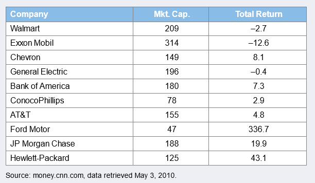 Company Mkt. Cap. Total Return Walmart 209 -2.7 Exxon Mobil 314 -12.6 Chevron 149 8.1 General Electric 196 -0.4 Bank of America 180 7.3 ConocoPhillips 78 2.9 AT&T 155 4.8 Ford Motor 47 336.7 JP Morgan Chase 188 19.9 Hewlett-Packard 125 43.1 Source: money.cnn.com, data retrieved May 3, 2010.
