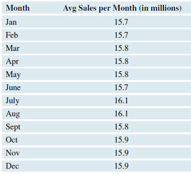 The following table shows the average number of vehicles sold in the United States monthly (in millions) for the years 2001 through 2018. Data on all monthly vehicle sales for these years were obtained and the average number per month was calculated. Would it be appropriate to do a chi-square analysis of this data set to see if vehicle sales are distributed equally among the months of the year? If so, do the analysis. If not, explain why it would be inappropriate to do so. (Source: www.fred.stlouisfed.org)