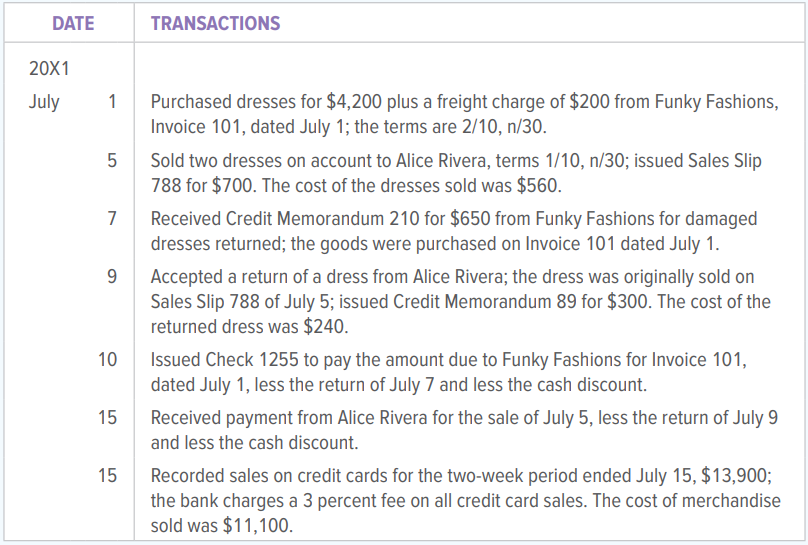 The following transactions took place at Fabulous Fashions Outlet during July 20X1. Fabulous Fashions Outlet uses a perpetual inventory system. The firm operates in a state with no sales tax. Record the transactions in a general journal. Use 8 as the page number for the general journal.