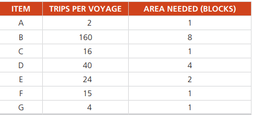 Using the following figure, indicate the best storage location for each item to minimize average distance travelled.