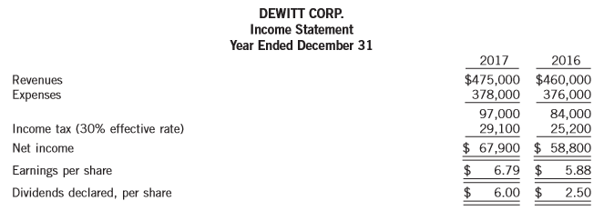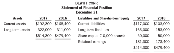DEWITT CORP. Statement of Financial Position December 31 Assets 2017 2016 Liabilities and Shareholders' Equity 2017 2016 Current assets $192,300 $168,400 Current liabilities $117,000 $103,000 Long-term assets 322,000 311,000 Long-term liabilities 166,000 153,000 $514,300 $479,400 Share capital (10,000 shares) 50,000 50,000 Retained earnings 181,300 173,400 $514,300 $479,400 DEWITT CORP. Income Statement Year Ended December 31 2017 2016 $475,000 $460,000 378,000 376,000 Revenues Expenses 97,000 29,100 84,000 25,200 Income tax (30% effective rate) Net income $ 67,900 $ 58,800 Earnings per share $ 6.79 $ 5.88 Dividends declared, per share $ 6.00 $ 2.50