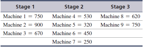 By suspending all their other jobs, they can devote three machines to the first stage, four to the second stage, and two to the last stage of the process. Posters that come off the machines at each stage can be processed on any of the machines at the next stage. However, all the machines are of different models and of varying ages, so they cannot process the same number of posters in the specified time frame necessary to complete the job. The different machine capacities at each stage are as follows:
