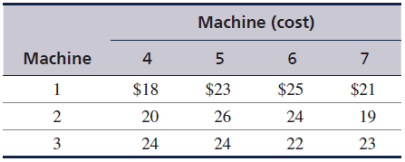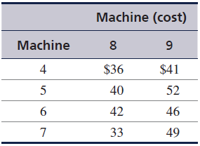 Because the machines are of different ages and types, the costs of producing posters on them differ. For example, a poster that starts on machine 1 and then proceeds to machine 4 costs $18. If this poster at machine 4 is then processed on machine 8, it costs an additional $36. The processing costs for each combination of machines for stages 1, 2, and 3 are as follows: