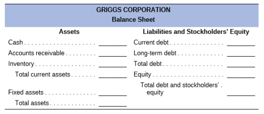 The Griggs Corporation has credit sales of $1,200,000. Given these ratios, fill in the following balance sheet.