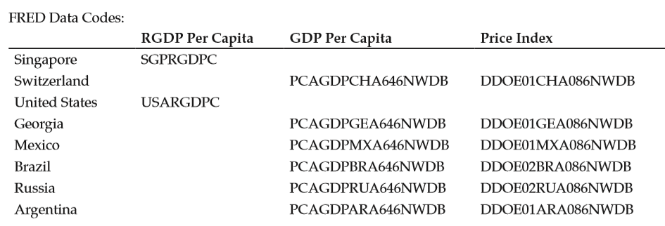 FRED Data Codes: RGDP Per Capita GDP Per Capita Price Index Singapore SGPRGDPC Switzerland PCAGDPCHA646NWDB DDOE01CHA086NWDB United States USARGDPC Georgia PCAGDPGEA646NWDB DDOE01GEA086NWDB Mexico PCAGDPMXA646NWDB DDOE01MXA086NWDB Brazil PCAGDPBRA646NWDB DDOE02BRA086NWDB Russia PCAGDPRUA646NWDB DDOE02RUA086NWDB Argentina PCAGDPARA646NWDB DDOE01ARA086NWDB