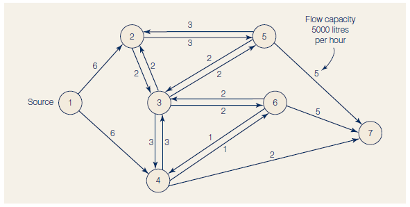 b. If a break occurs on line 2â3 and it is closed down, what is the maximal flow for the system? How long will it take to transmit 100 000 litres to location 7?