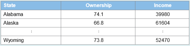 State Ownership Income Alabama 74.1 39980 Alaska 66.8 61604 Wyoming 73.8 52470