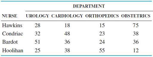 The hospital administrator at St. Charles General must appoint head nurses to four newly established departments: urology, cardiology, orthopedics, and obstetrics. In anticipation of this staffing problem, she had hired four nurses: Hawkins, Condriac, Bardot, and Hoolihan. Believing in the quantitative analysis approach to problem solving, the administrator has interviewed each nurse; considered his or her background, personality, and talents; and developed a cost scale ranging from 0 to 100 to be used in the assignment. A 0 for Nurse Bardot being assigned to the cardiology unit implies that she would be perfectly suited to that task. A value close to 100, on the other hand, would imply that she is not at all suited to head that unit. The table below gives the complete set of cost figures that the hospital administrator felt represented all possible assignments. Which nurse should be assigned to which unit?