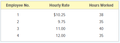 > During one week, four production employees of Morgan Manufacturing Company worked the hours shown below. All these employees receive overtime pay at one and one-half times their regular hourly rate for any hours worked beyond 40 in a week. Determine the