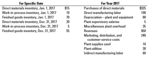 For Specific Date Direct materials inventory, Jan. 1, 2017 Work-in-process inventory, Jan. 1, 2017 Finished goods inventory, Jan. 1, 2017 Direct materials inventory, Dec. 31, 2017 Work-in-process inventory, Dec. 31, 2017 Finished goods inventory, Dec. 31, 2017 For Year 2017 Purchases of direct materials Direct manufacturing labor Depreciation-plant and equipment Plant supervisory salaries Miscellaneous plant overhead Revenues Marketing, distribution, and customer-service costs $15 $325 10 100 70 80 20 5 35 55 950 240 Plant supplies used Plant utilities 10 30 60 Indirect manufacturing labor