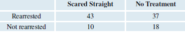 The idea of sending delinquents to âScared Straightâ programs has appeared recently in several media programs (such as Dr. Phil) and on a program called Beyond Scared Straight. So it seems appropriate to look at a randomized experiment from the past. In 1983, Roy Lewis reported on a study in California. Each male delinquent in the study (all were aged 14â18) was randomly assigned to either Scared Straight or no treatment. The males who were assigned to Scared Straight went to a prison, where they heard prisoners talk about their bad experiences there. Then the males in both the experimental and the control group were observed for 12 months to see whether they were rearrested. The table shows the results. (Source: Lewis, âScared straightâCalifornia style: Evaluation of the San Quentin Squires program,â Criminal Justice and Behavior, vol. 10 [June 1983]: 209â226)