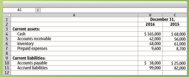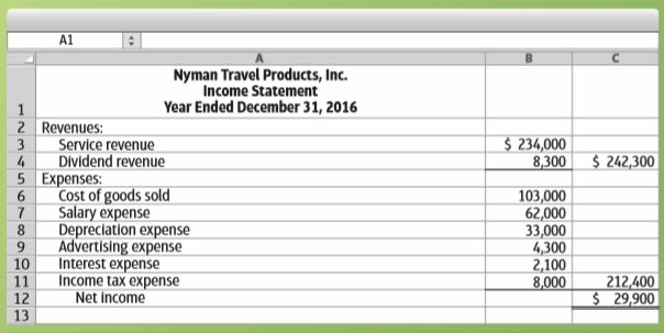 A1 Nyman Travel Products, Inc. Income Statement Year Ended December 31, 2016 1 2 Revenues: 3 Service revenue $ 234,000 8,300 4 Dividend revenue $ 242,300 5 Expenses: Cost of goods sold 103,000 62,000 33,000 4,300 2,100 8,000 7 Salary expense 8 Depreciation expense 6. Advertising expense Interest expense Income tax expense Net income 10 212,400 $ 29,900 11 12 13 A1 1 2 3 Current assets: December 31, 2015 2016 $ 165,000 42,000 48,000 9,600 $ 68,000 56,000 61,000 8,700 Cash 4 Accounts receivable Inventory 7 Prepaid expenses 8 9 Current liabilities: $ 38,000 99,000 Accounts payable $ 25,000 82,000 10 11 Accrued liabilities 12