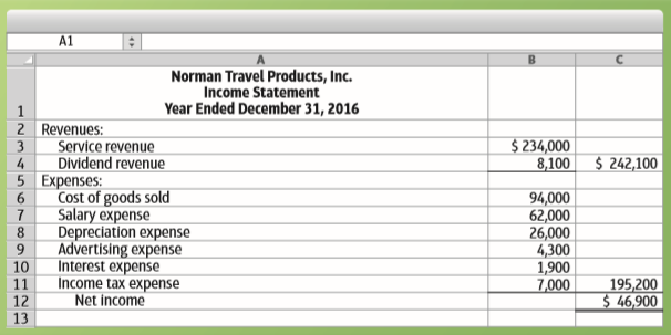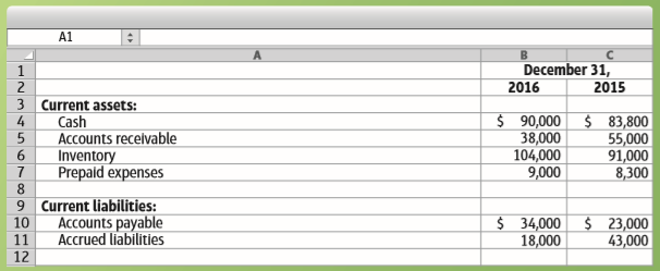 A1 Norman Travel Products, Inc. Income Statement Year Ended December 31, 2016 1 2 Revenues: 3 $ 234,000 8,100 Service revenue Dividend revenue 5 Expenses: Cost of goods sold 7 4 $ 242,100 94,000 62,000 26,000 4,300 1,900 7,000 Salary expense Depreciation expense Advertising expense Interest expense Income tax expense Net income 8. 10 195,200 $ 46,900 11 12 13 A1 December 31, 2016 2015 3 Current assets: Cash Accounts receivable Inventory Prepald expenses 8. 9 Current liabilities: Accounts payable Accrued liabilities Ŝ 90,000 $ 83,800| 38,000 55,000 104,000 91,000 9,000 8,300 10 11 $ 34,000 18,000 $ 23,000 43,000 12 1234 567