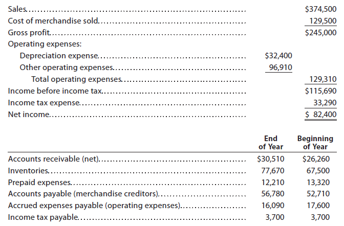 > The net income reported on the income statement for the current year was $73,600. Depreciation recorded on store equipment for the year amounted to $27,400. Balances of the current asset and current liability accounts at the beginning and end of the year