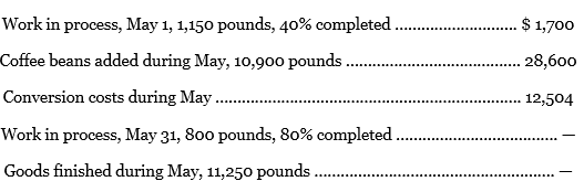 Work in Process, May 1, 1,150 pounds, 40% completed $ 1,700 Coffee beans added during May, 10,900 pounds 28,600 Conversion costs during May .... 12,504 Work in process, May 31, 800 pounds, 80% completed. Goods finished during May, 11,250 pounds.