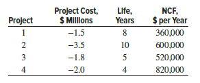 The independent project estimates below have been developed by the engineering and finance managers at Golphanen Enterprises. The corporate MARR is 8% per year, and the capital investment limit set by the CFO is $4 million. As a new employee in the Engineering Department, you have been asked to recommend the economically best projects. Use