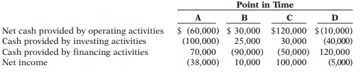 Point in Time A B D Net cash provided by operating activities Cash provided by investing activities Cash provided by financing activities $ (60,000) $ 30,000 $120,000 $(10,000) 25,000 (90,000) 10,000 (100,000) 70,000 (38,000) (40,000) (50,000) 120,000 (5,000) 30,000 Net income 100,000