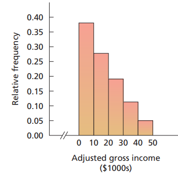 The Internal Revenue Service (IRS) publishes data on adjusted gross incomes in the document Statistics of Income, Individual Income Tax Returns. The following relative-frequency histogram shows one year’s individual income tax returns for adjusted gross incomes of less than $50,000.