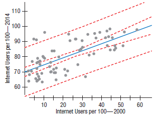The Internet has revolutionized business and offers unprecedented opportunities for globalization. However, the ability to access the Internet varies greatly among different regions of the world. One of the variables the United Nations collects data on each year is Internet Users per 100 Population (mdgs.un.org/unsd/ mdg/Data.aspx) for various countries. Below is a scatterplot showing the regression line, 95% confidence intervals, and 95% prediction intervals using 2000 and 2014 Internet use (Internet users per 100 population) for a sample of 70 countries. The response variable is Internet Users per 100â2014.