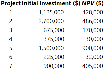 The investment committee of a company has identified the following seven projects with positive NPVs. If the board of directors has approved a $4.5 million capital budget for the current period, which projects should be selected?