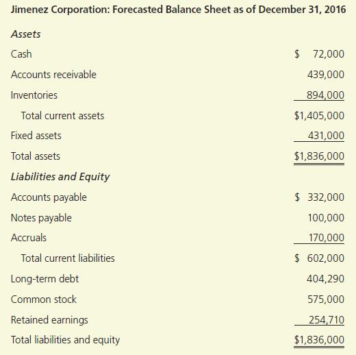 Jimenez Corporation: Forecasted Balance Sheet as of December 31, 2016 Assets Cash $ 72,000 Accounts receivable 439,000 Inventories 894,000 Total current assets $1,405,000 Fixed assets 431,000 Total assets $1,836,000 Liabilities and Equity Accounts payable $ 332,000 Notes payable 100,000 Accruals 170,000 Total current liabilities $ 602,000 Long-term debt 404,290 Common stock 575,000 Retained earnings 254,710 Total liabilities and equity $1,836,000