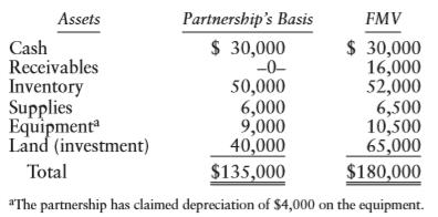 Assets Partnership's Basis FMV $ 30,000 -0- 50,000 6,000 9,000 40,000 $135,000 $ 30,000 16,000 52,000 6,500 10,500 65,000 $180,000 Cash Receivables Inventory Supplies Equipment Land (investment) Total aThe partnership has claimed depreciation of $4,000 on the equipment.