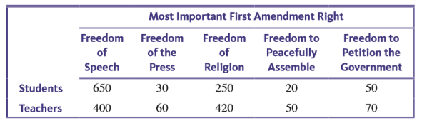The Knight Foundation asked each person in a representative sample of high school students and in a representative sample of high school teachers which of the rights guaranteed by the First Amendment they thought was the most important (âFuture of the First Amendment 2014 Survey of High School Students and Teachers,â www.knightfoundation.org/media /uploads/publication_pdfs/Future_of_the_First_Amendment _cx2.pdf, retrieved May 27, 2017). Suppose that the sample size for each sample was 1000. Data consistent with summary values given in the paper are summarized in the accompanying table.