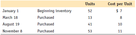 Units Cost per Unit January 1 Beginning inventory $ 7 52 March 18 Purchased 13 8 August 19 Purchased 41 10 November 8 Purchased 53 11
