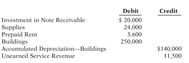 Debit Credit $ 20,000 24,000 3,600 250,000 Investment in Note Receivable Supplies Prepaid Rent Buildings Accumulated Depreciation-Buildings Unearned Service Revenue $140,000 11,500