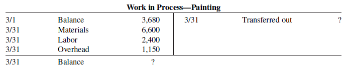 Work in Process-Painting 3/1 Balance 3,680 3/31 Transferred out ? 3/31 Materials 6,600 3/31 Labor 2,400 1,150 3/31 Overhead 3/31 Balance ?