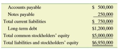 Accounts Payable $ 500,000 Notes payable 250,000 Total current liabilities $ 750,000 Long-term debt $1,200,000 Total common stockholders' equity $5,000,000 $6,950,000 Total liabilities and Stockholders' equity