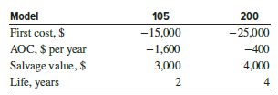 > The PW-based relation for the incremental cash flow series to find Δi* between the lower first-cost alternative X and alternative Y has been developed. 0 = − 40,000 + 9000(P∕A,Δi*,10) − 2000(P∕F,Δi*,10) Determine the highest MARR value for which Y is pre