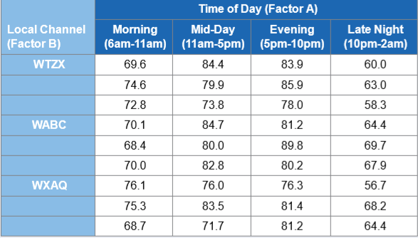 Time of Day (Factor A) Local Channel Mid-Day Evening Morning (6am-11am) (11am-5pm) (5pm-10pm) (10pm-2am) Late Night (Factor B) WTZX 69.6 84.4 83.9 60.0 74.6 79.9 85.9 63.0 72.8 73.8 78.0 58.3 WABC 70.1 84.7 81.2 64.4 68.4 80.0 89.8 69.7 70.0 82.8 80.2 67.9 WXAQ 76.1 76.0 76.3 56.7 75.3 83.5 81.4 68.2 68.7 71.7 81.2 64.4