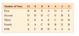 The Motley Crew Investing Club wishes to purchase stock in a pharmaceutical company. The choices are American Pharmacy (A), BurrowsWelcome (B), Chicago Labs (C), Dow Chemical (D), and Emerging Medicines (E). The choice rankings are shown in the following preference table.