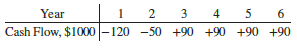 Year 12 3 4 5 6 Cash Flow, $1000-120 -50 +90 +90 +90 +90
