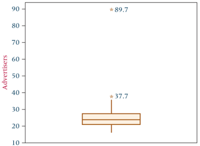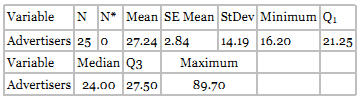 Variable Advertisers 25 0 Variable Median Q3 Advertisers 24.00 27.50 N N Mean SE Mean StDev Minimum Q₁ 27.24 2.84 14.19 16.20 21.25 Maximum 89.70 Advertisers 90 80 70 60 50 40 30 20 10 T * 89.7 * 37.7